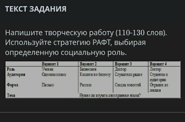 Напишите творческую работу 110 130 слов Используйте стратегию роста выбирая определенную социальную роль первый вариант ученик Одноклассник письмо второй вариант бизнесмен коллеги по бизнесу рассказ третий вариант директора слушать радио Свобода новостей вариант 4 Лектор студенты в аудио открытки из лекции