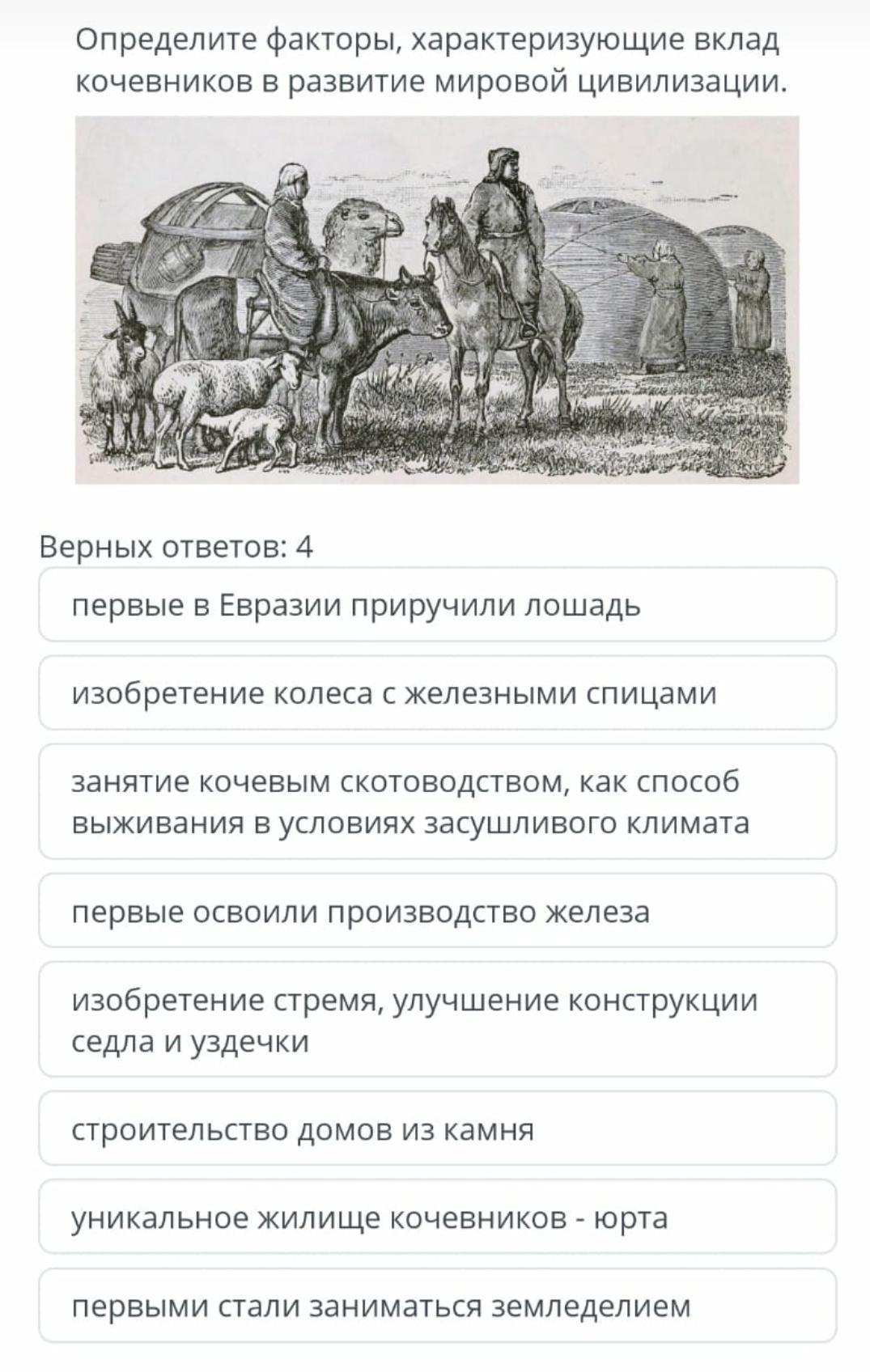 приучили лошадь, юрта, изобретения стремя, занятие кочевым скотоводством.