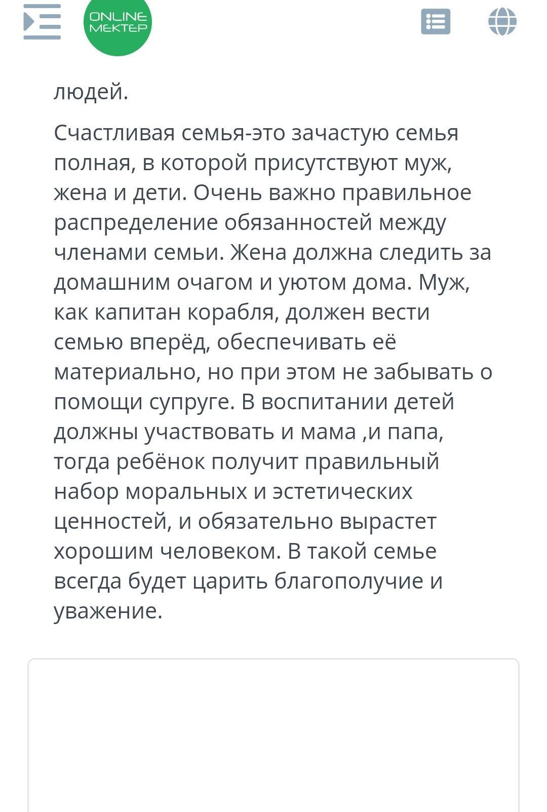 Определить и кратко записать основную мысль текста: Что такое семейное счастье? Многие задаются этим вопросом. Кто-то думает что семейное счастье заключается в материальном благополучии, а кто-то считает что самое главное-это взаимопонимание и гармония между членами семьи. Я думаю, что никакая даже самая благополучная в материальном плане семья не может быть счастливой, если в ней отсутствует гармония. Ведь семья- это в первую очередь тот небольшой круг людей, на которых ты можешь всегда положиться, без опаски на то, что они предадут тебя. Зачастую семья-это единственное настоящее счастье человека. Гармония в семье, а следовательно и семейное счастье, достигается только искренней и бескорыстной любовью к ближнему. Семья, в которой нет любви, никогда не станет счастливой. Ещё одним важным фактором для формирования семейного счастья можно выделить уважение и