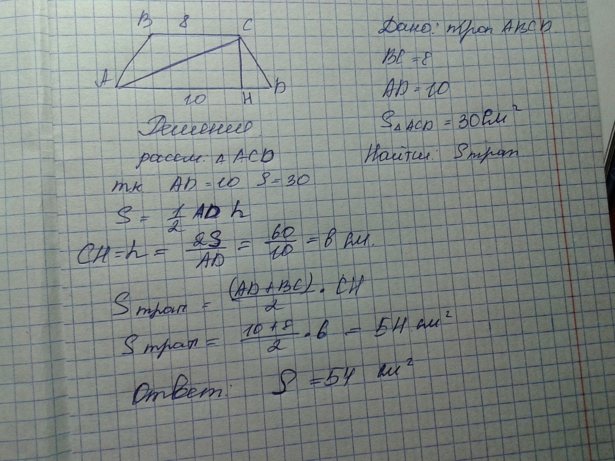 В трапеции ABCD основания AD и BC равны 10 см и 8 см соответственно. Площадь