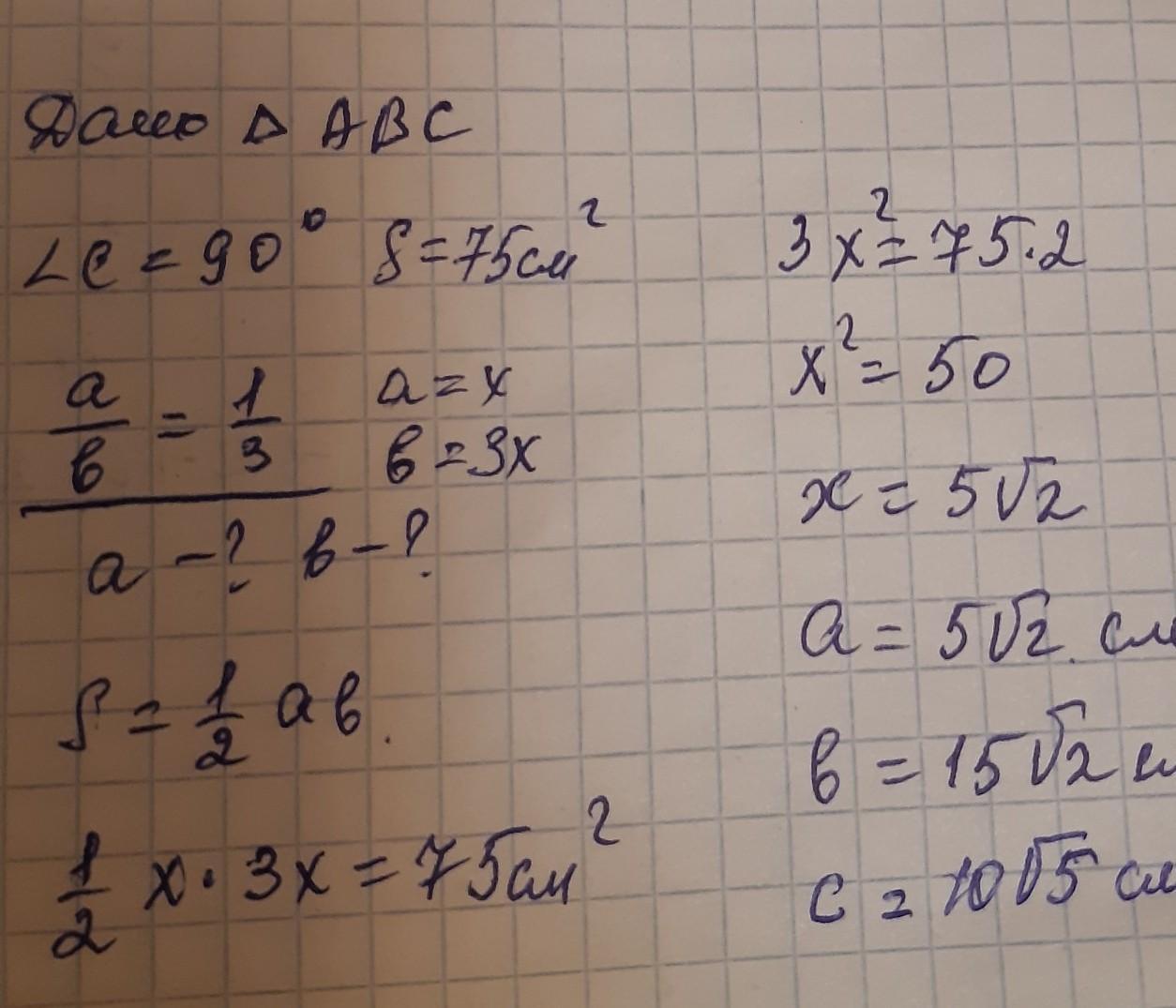 площадь прямоугольного треугольника равна 75 см квадратных Найдите его стороны если они относятся друг к другу как 1/3
