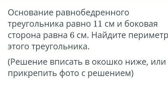 Основание равнобедренного треугольника равно 11 см и боковая сторона равна 6 см. Найдите периметр этого треугольника. (Решение вписать в окошко ниже, или прикрепить фото с решением)