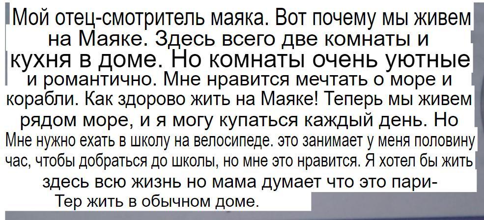 Мой отец - смотритель маяка. Поэтому мы живём в маяке. В нем только две комнаты и кухня. Но в комнатах очень уютно и романтично. Я люблю мечтать о море и кораблях. Жить в маяке очень прикольно! Сейчас мы живём рядом с морем, и я могу плавать каждый день. Но мне приходится добираться до школы на велосипеде. Это занимает у меня полчаса, но мне это нравится. Я бы хотел жить здесь всегда, но моя мама считает, что лучше жить в обычном доме.
