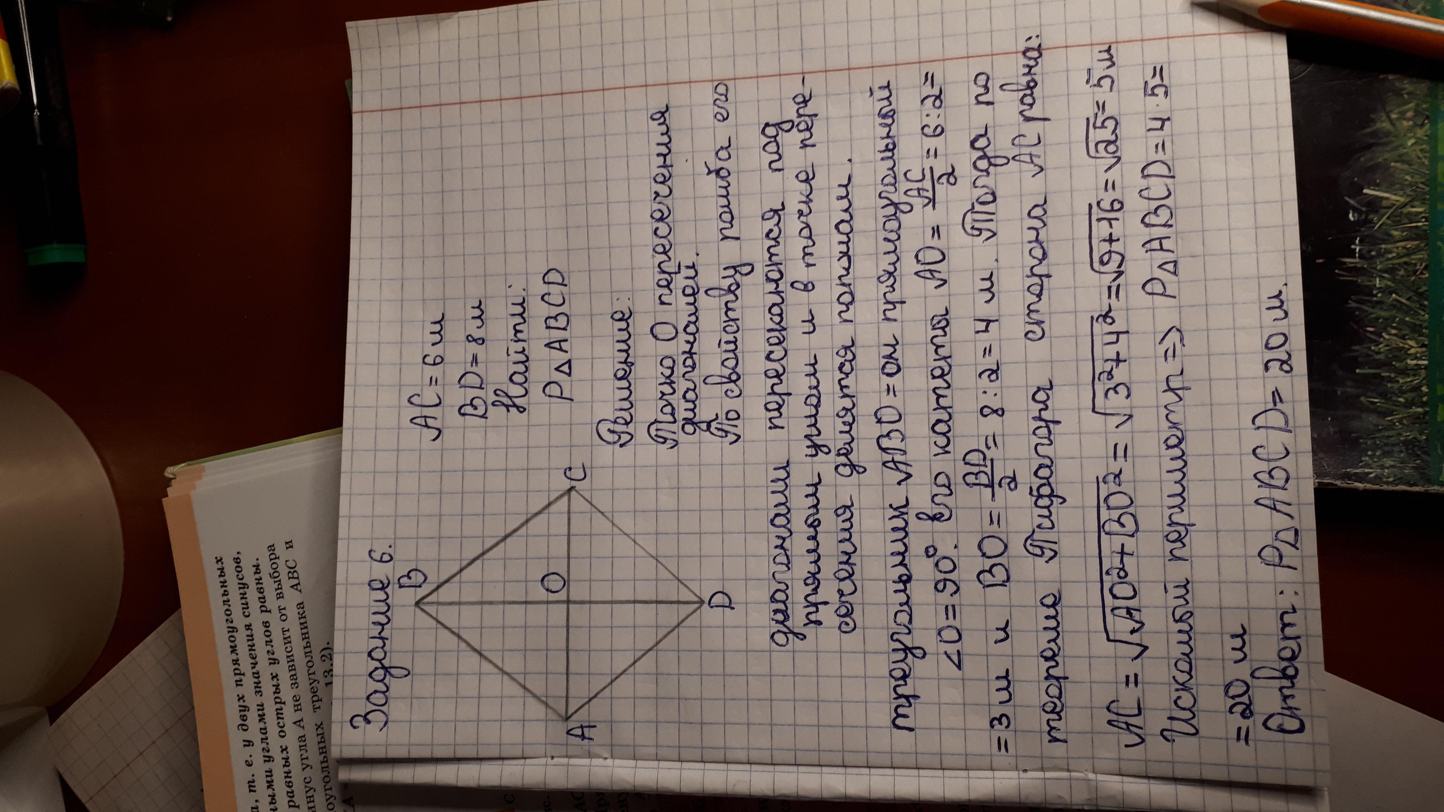 Найдите периметр ромба ABCD, если его диагонали AC и BD равны 6м и 8 м.