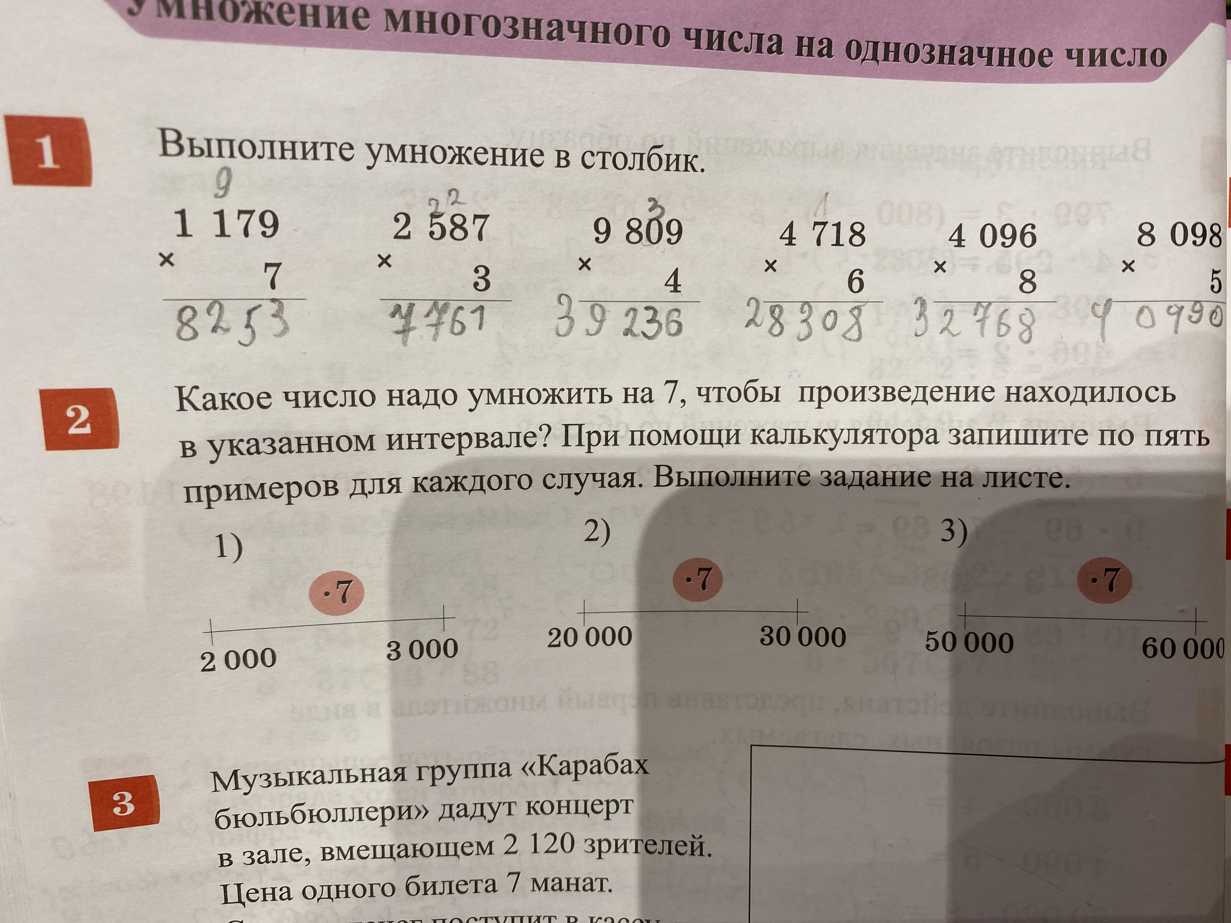 Какое число надо × 7, чтобы произведение находилась в указанном интервале вопрос при помощи калькулятора запишите по пять Примеров для каждого случая. Выполните задания на листе.