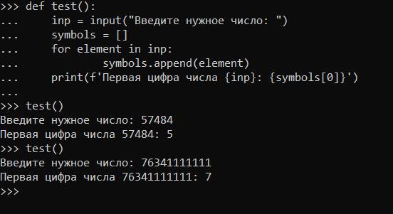 print(f"Первая цифра числа {inp}: {list[0]}")