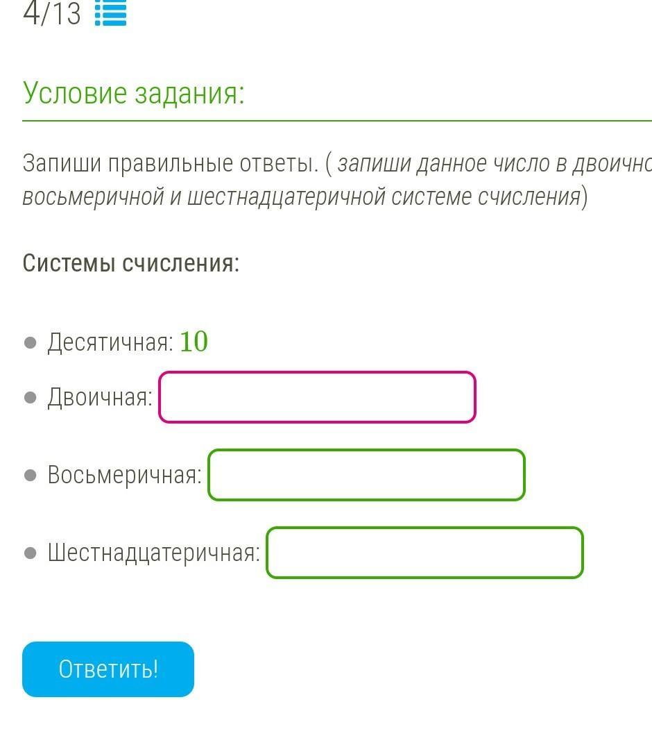 Запиши правильные ответы. ( запиши данное число в двоичной, восьмеричной и шестнадцатеричной системе счисления)