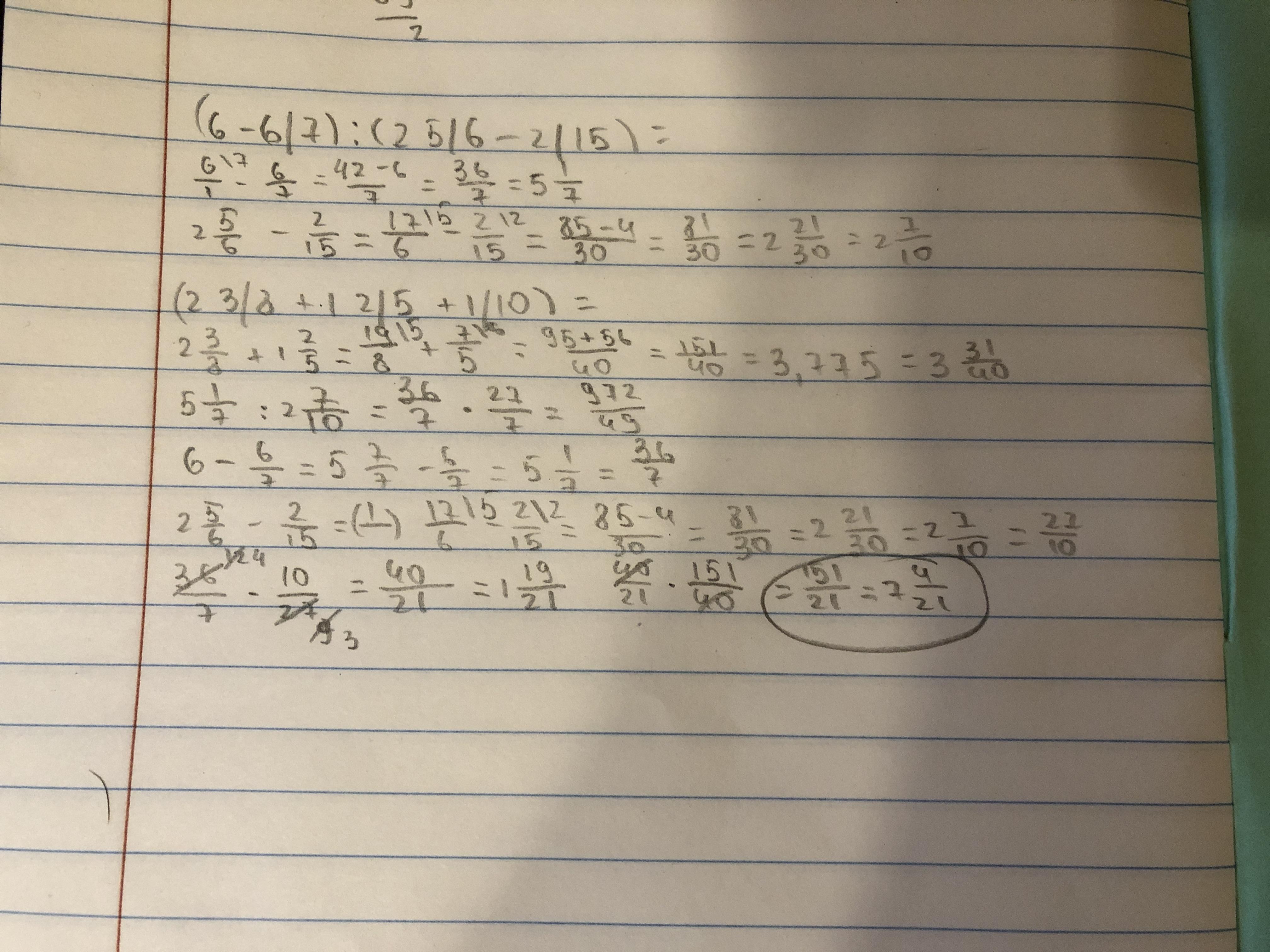 Вычислите (6-6/7):(2 5/6-2/15)*(2 3/8+1 2/5+1/10