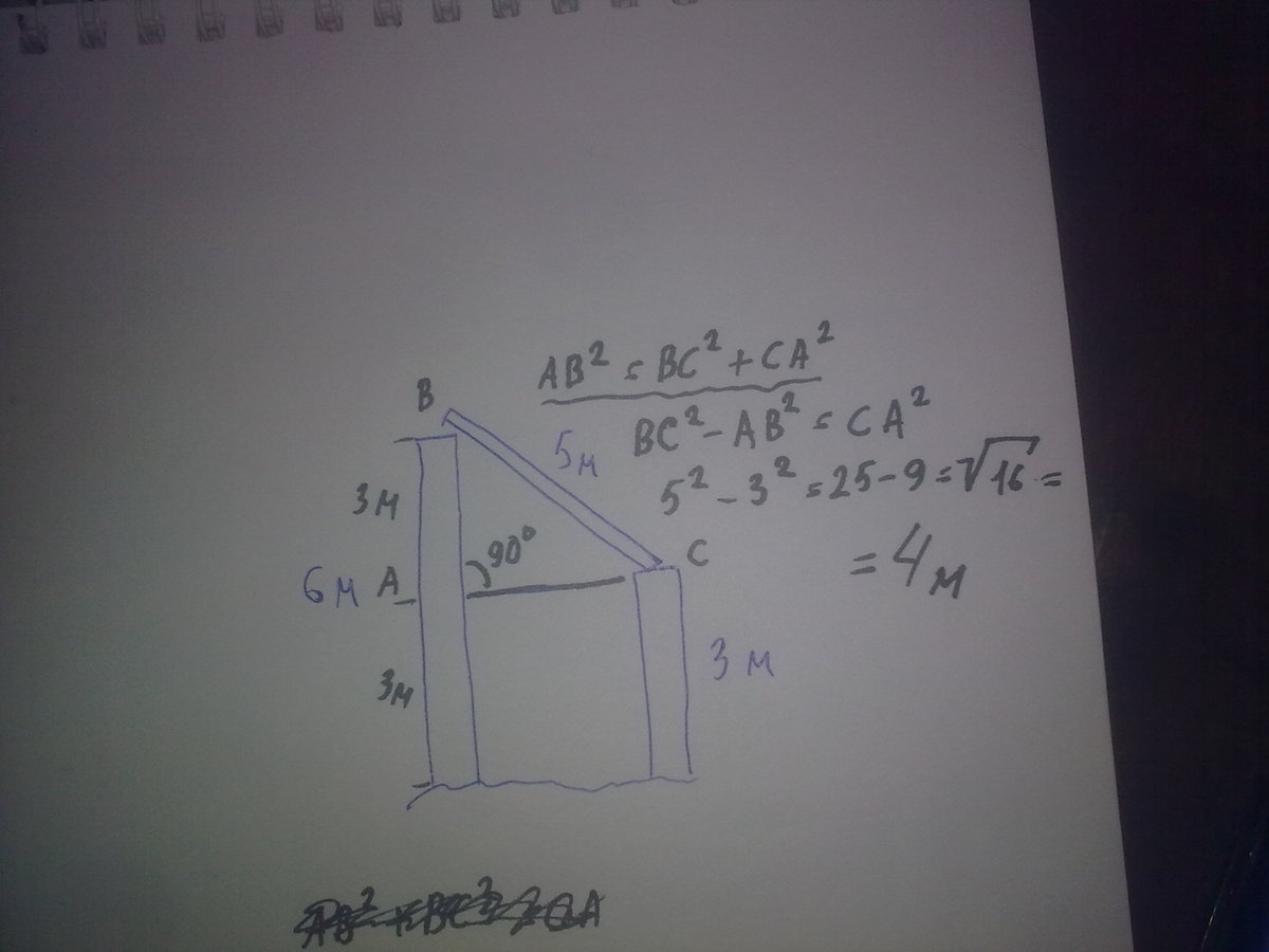 Перекладина длинной 5 м своими концами лежит на двух вертикальных столбах высотой 3 м и 6 м. Каково расстояние между основаниями столбов?