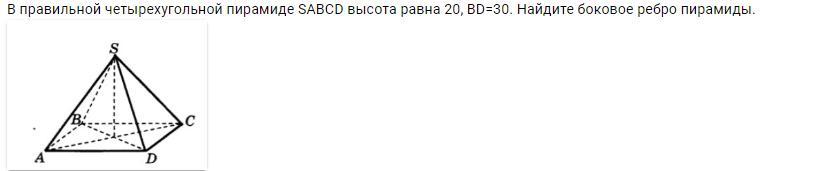 В правильной четырехугольной пирамиде SABCD высота равна 20, BD=30. Найдите боковое ребро пирамиды.