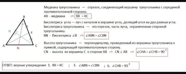 2. В треугольнике АВС проведены медиана АК, биссек- триса BN и высота СН. Укажите номера верных утвержде- ний: 1) ВК- ск 2) АН — ВН 3) 2ABN - 2СBN 4) 2BAK - 2САК 5) ZAKB 3D 90° 6) ZCHB - 90°