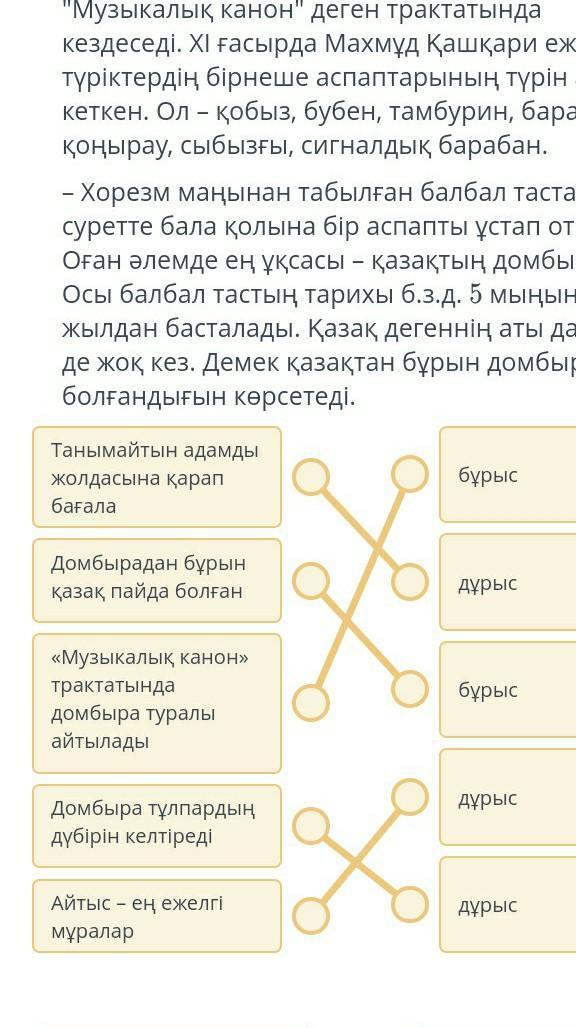 1- тапсырма. Мәтіндерді мұқият оқып, тұжырымдардың дұрыс, бұрыстығын анықтап, кестені толтырыңыз1- мәтін Ертеде бір ақылды қария болыпты.Бір күні ақылды қарияға бір жігіт келіп:-Ақсақал, мен қандай жігітпін? Сынаңызшы, -депті.Қарт жігітке:-Жолдасыңды көрсет, сонан соң айтамын, -депті. Жігіт жолдасын қартқа жіберіпті.Қарт жігіттің жолдасымен ұзақ сөйлесіп, ақырында жігіттің өзін шақырыпты.Жігіт келген соң, қарт:-Шырағым, жаман жігіт емессің,-депті.-Қалайша олай дейсіз? Мені бұрын көрген жоқсыз ғой?-депті жігіт.Қарт күліп:-”Жігітті жолдасына қарап бағала” дейді халық,-депті.2- мәтінҚазақтың киіз үйі, қара домбырасы және айтыс өнері әлем елдерінің ең ежелгі мұралары ретінде "ЮНЕСКО" тізіміне енгені белгілі. Табиғаттың үнін, тұлпардың дүбірін, адамның сырын шанағынан төгілткен домбыра енді жыл сайын ұлықталатын болды.Домбырадан төгілген күмбір-күмбір күйлер кейде сылқ-сылқ күлген ару қыздың күлкісін елестетсе, кейде сылдыр- сылдыр бұлақ үнін құлағыңызға әкеледі. Сол сәтте көлбең-көлбең сағым елес көз алдыңыздан өтеді.Алтайдан Анадолыға дейінгі түркі халықтарында домбыра аспабы кең таралғанын білеміз. Қазақтың қара домбырасының тарихы тым әріден басталатындығын айғақтайтын деректер жетерлік. Домбыраны талай ғалымдар зерттеп,тер төкті. Білгендерімен бөлісті. Мысалы, Әбу Насыр әл-Фарабидың еңбектерінде тамбур аспабы жайлы айтылады. Өзбектердің дутары алғаш рет әл-Хусейнидің "Музыкалық канон" деген трактатында кездеседі. XI ғасырда Махмұд Қашқари ежелгі түріктердің бірнеше аспаптарының түрін атап кеткен. Ол – қобыз, бубен, тамбурин, барабан, қоңырау, сыбызғы, сигналдық барабан.– Хорезм маңынан табылған балбал тастағы суретте бала қолына бір аспапты ұстап отыр. Оған әлемде ең ұқсасы – қазақтың домбырасы. Осы балбал тастың тарихы б.з.д. 5 мыңыншы жылдан басталады. Қазақ дегеннің аты да, иісі де жоқ кез. Демек қазақтан бұрын домбыраның болғандығын көрсетеді. [5]Тұжырымдар дұрыс бұрысТанымайтын адамды жолдасына қарап бағала Домбырадан бұрын қазақ пайда болған «Музыкалық канон» трактатында домбыра туралы айтылады Домбыра тұлпардың дүбірін келтіреді Айтыс – ең ежелгі мұралар *