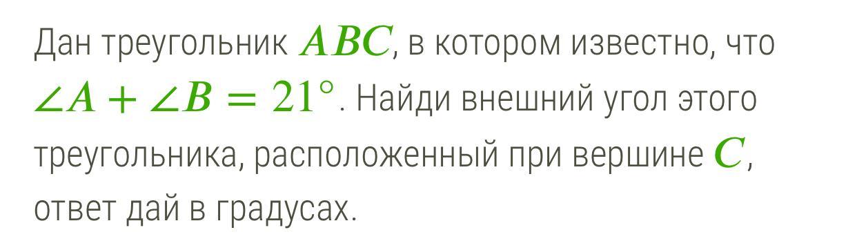 Внешний угол при вершине треугольника равен сумме двух внутренних углов не смежных с ним. ⇒ величина угла смежного с углом С равна ∠А+∠В=21°.