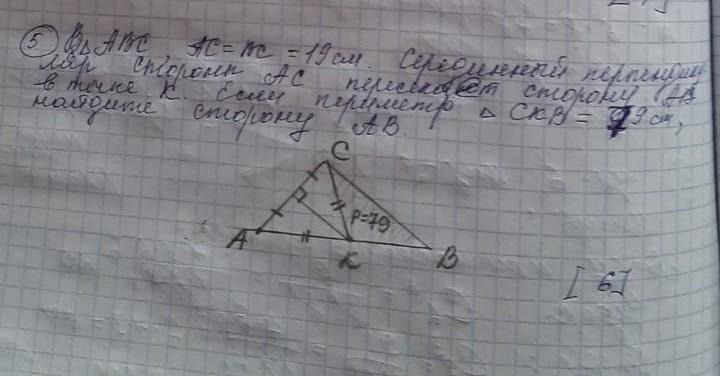 В ΔАВК серединный перпендикуляр является высотой и медианой, следовательно ΔАВК - равнобедренный и АК=ВК.