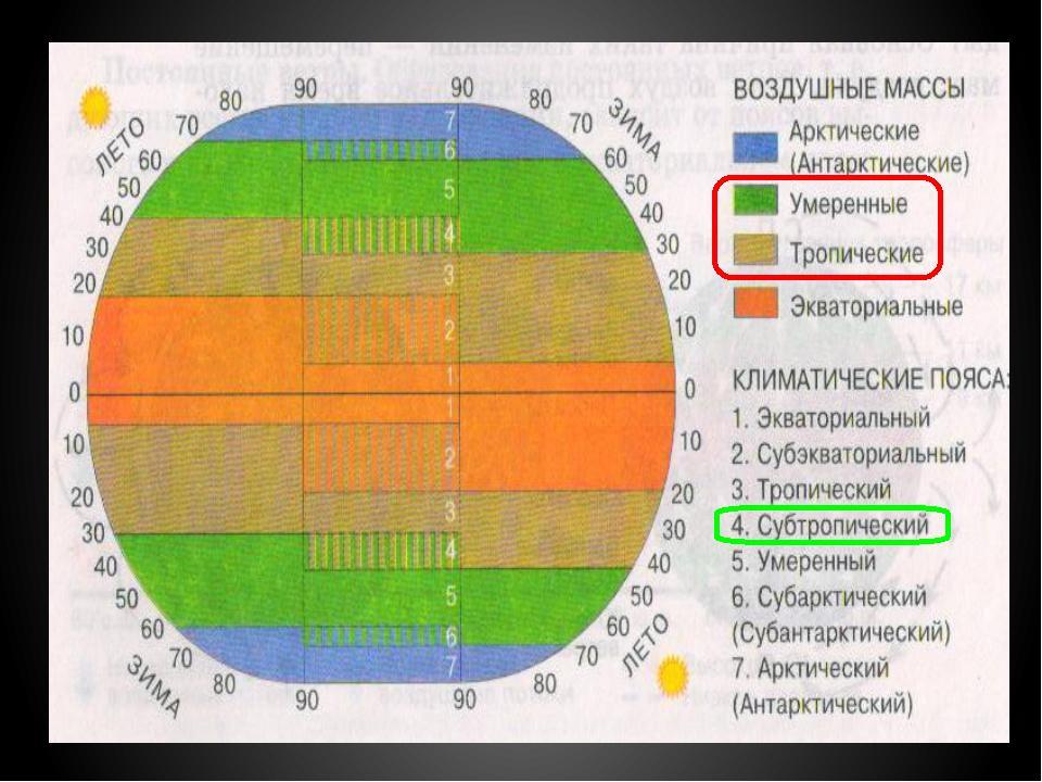 Воспользуемся картой. На ней видно, что в субтропическом климатическом поясе летом господствуют тропические воздушные массы, а зимой - умеренные.