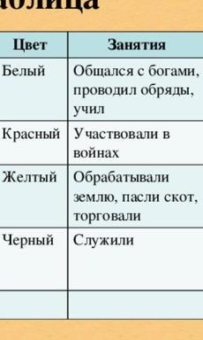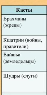 касты делились на жрецы - брахманы, воины - кшатрии , земледельцы, ремесленники и торговцы - вайшья , слуги и рабы - шудры