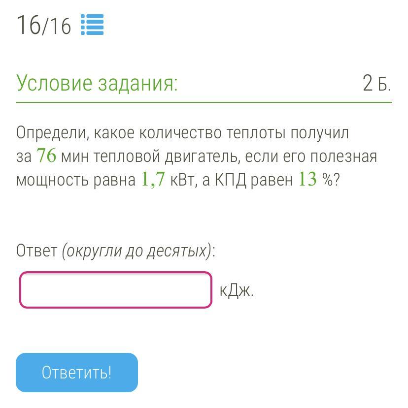 Определи, какое количество теплоты получил за 76 мин тепловой двигатель, если его полезная мощность равна 1,7 кВт, а КПД равен 13 %?