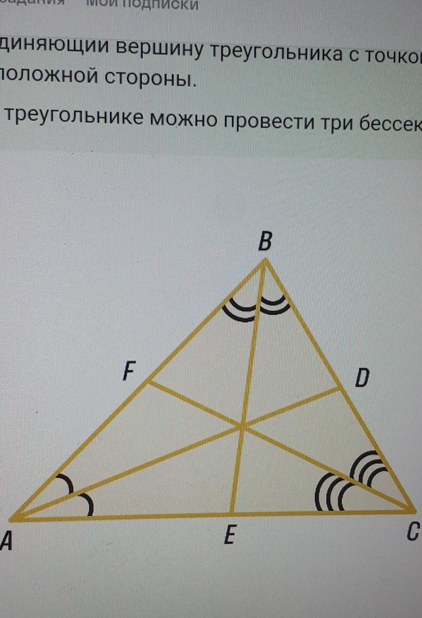 - Биссектриса треугольника - это такой отрезок в треугольнике, который делит угол треугольника на два равных угла.