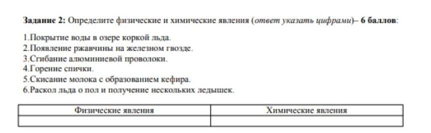 1 - физическое, 2-химическое, 3- физическое, 4- химическое, 5-химическое, 6- физическое