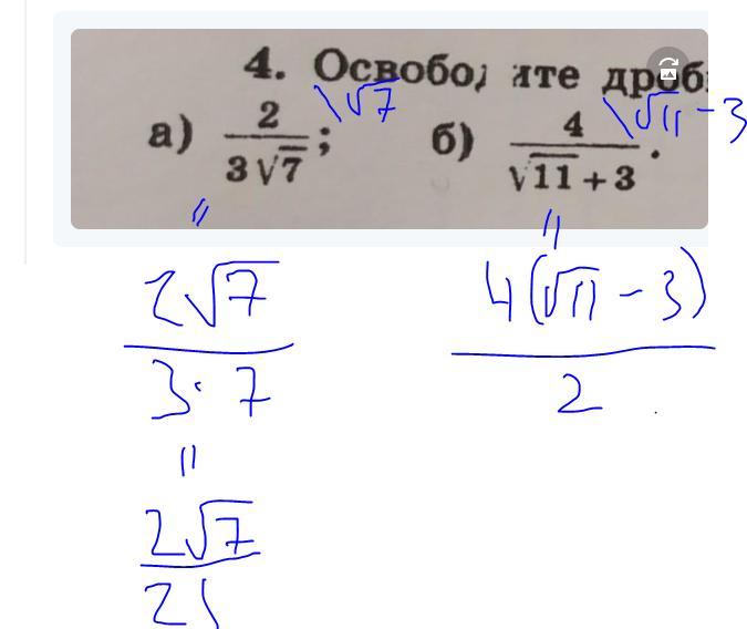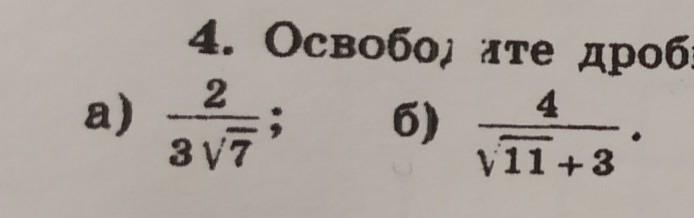 вот домоножим всю дробь на сопряженную в первом случаи на корень из 7 а во втором так чтобы внизу получилось разность квадратов то есть (a-b)(a+b)