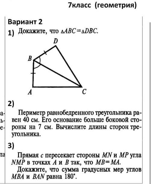 1) Треугольники равны, так как ВС - общая сторона, АВ=BD по условиюи угол DBC равен углу ABD