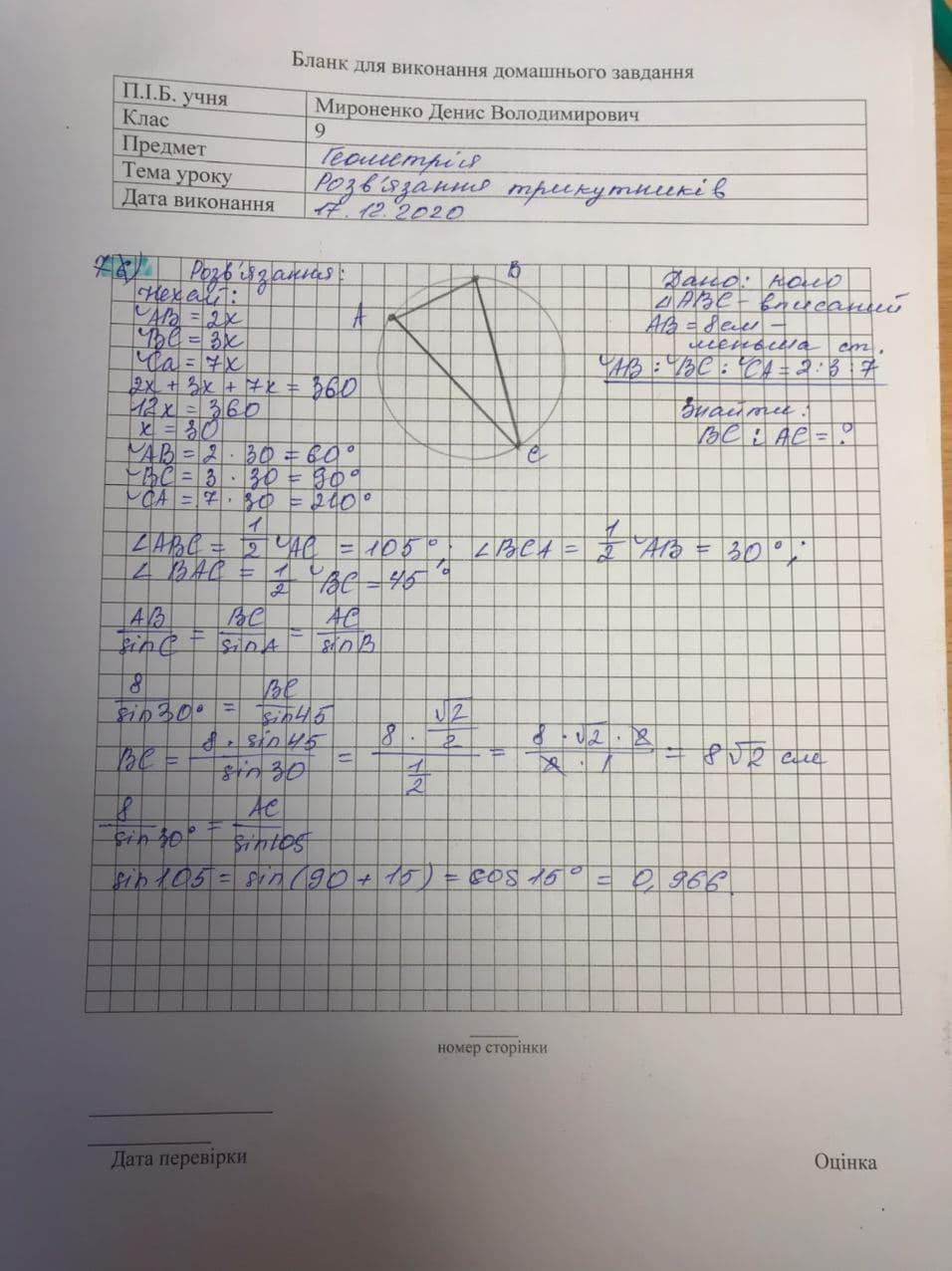 Менша сторона трикутника, вписаного у коло, дорівнює 8 см, а вершини трикутника поділяють коло на три дуги, градусні міри яких відносяться як 2:3:7. Знайдіть невідомі сторони трикутника.