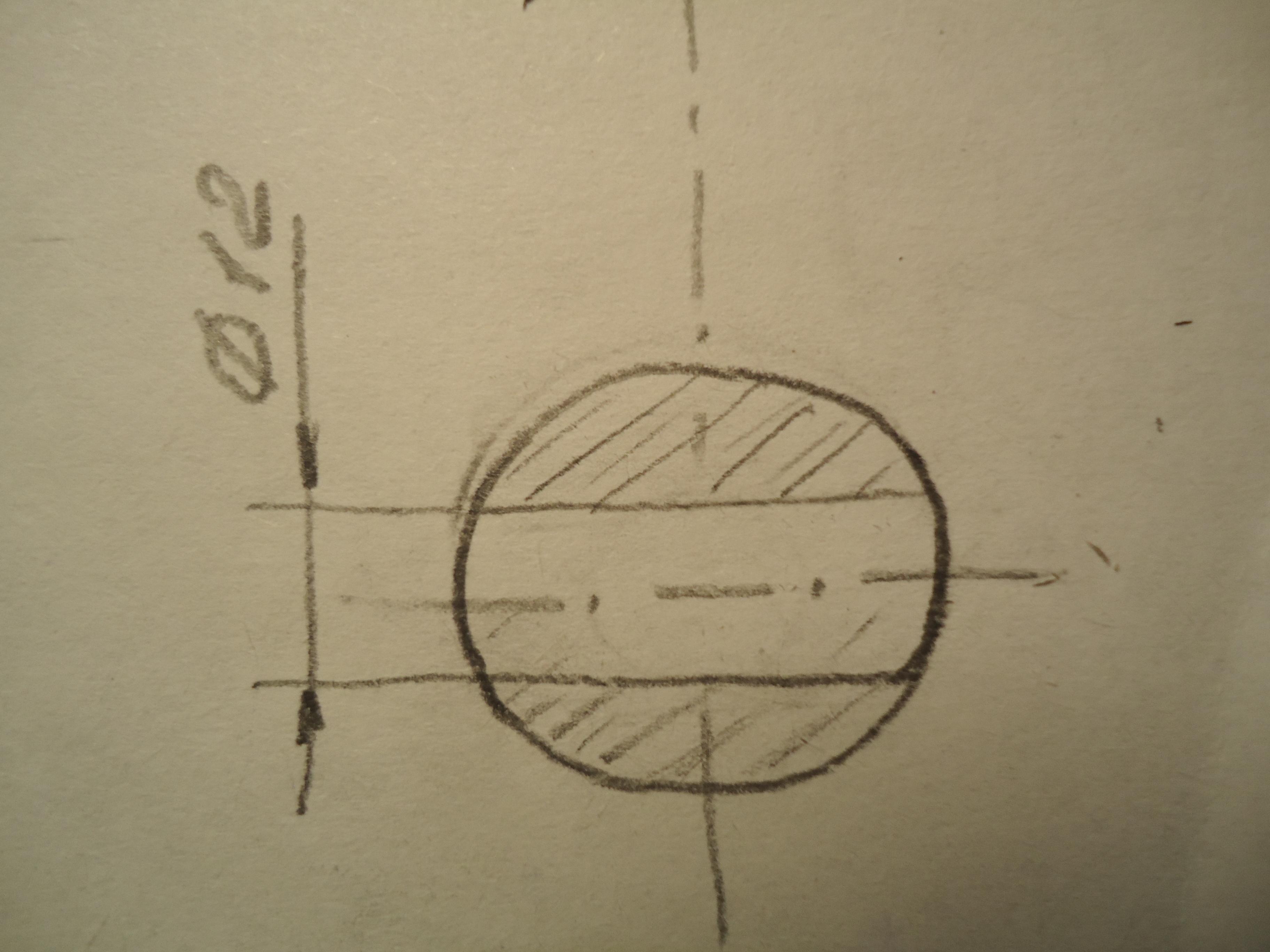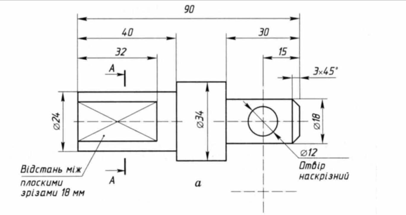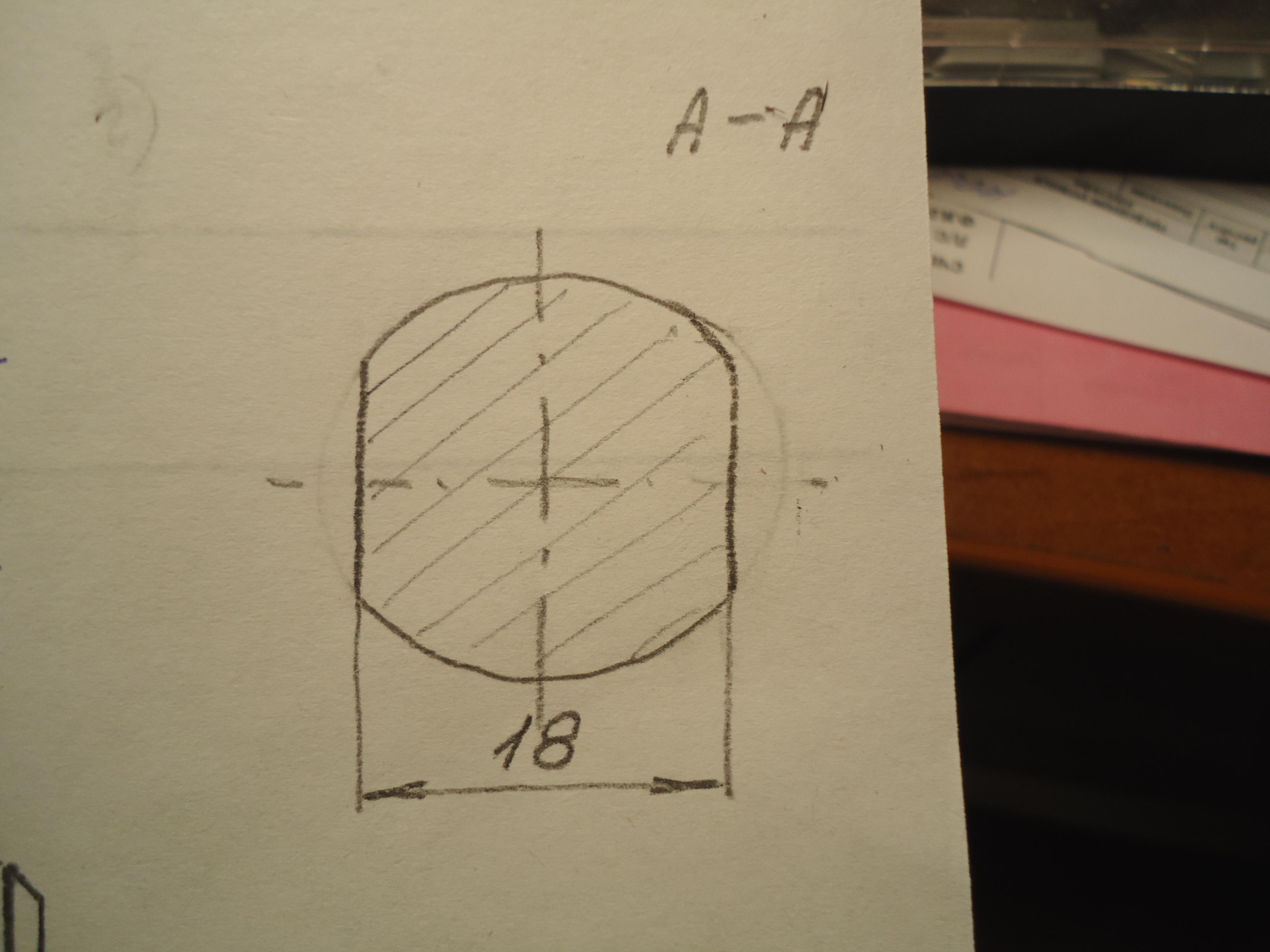 На свободном поле чертежа выполните окружность диаметром 24 мм по бокам срежьте окружность так, чтобы расстояние между вертикальными плоскостями было 18 мм. Выполните штриховку и обозначьте сечение А-А. См. фото 1.