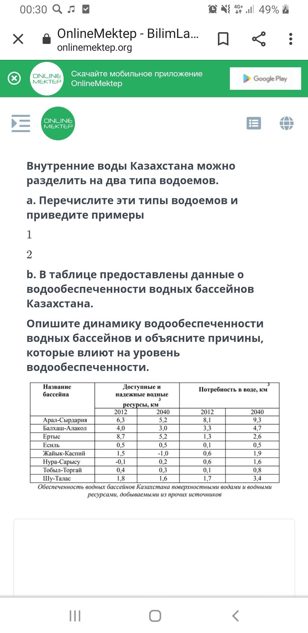 б) Как видно из таблицы, приведенной выше, динамика водообеспеченности водных бассейнов Казахстана меняется.Почти во всех бассейнах в 2040 году объём воды уменьшится, а потребность в воде увеличится.Это связано с изменением климата (глобальным потеплением), уменьшением объёма воды в реках, опустыниванием земель.
