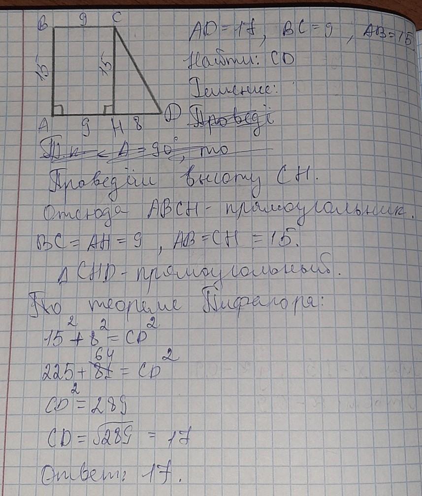 в прямоугольнойтрапеции авсд, угол А прямой, основание трапеции равны 17 и 9 найдите длину большой боковой стороны если АВ - 15 см