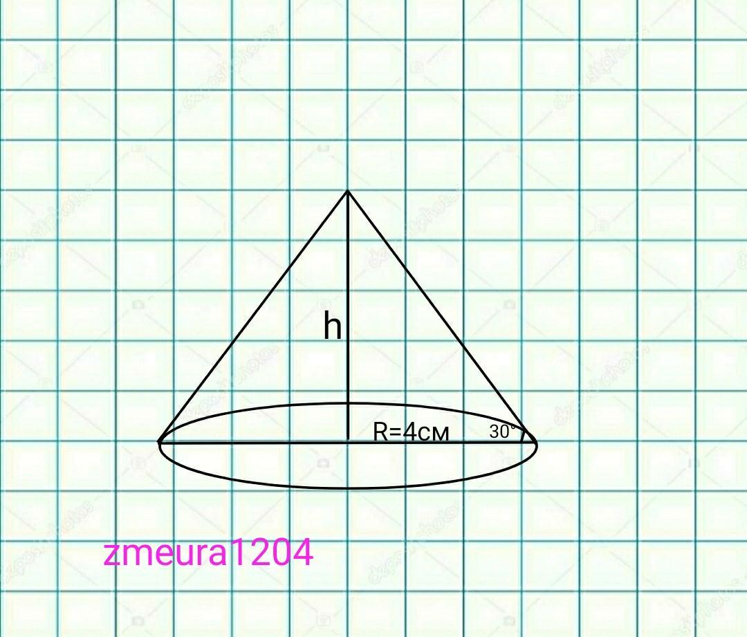 Радіус основи конуса дорівнює 4 см, а твірна утворює з площиною основи кут 30°. Знайдіть:г) Площу осьового перерізу конуса.