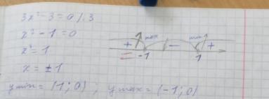 y'=3x^2-3, 3x^2-3=0, x^2-1=0, x^2=1, x=-1, x=1 (точки экстремума)