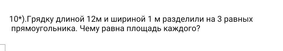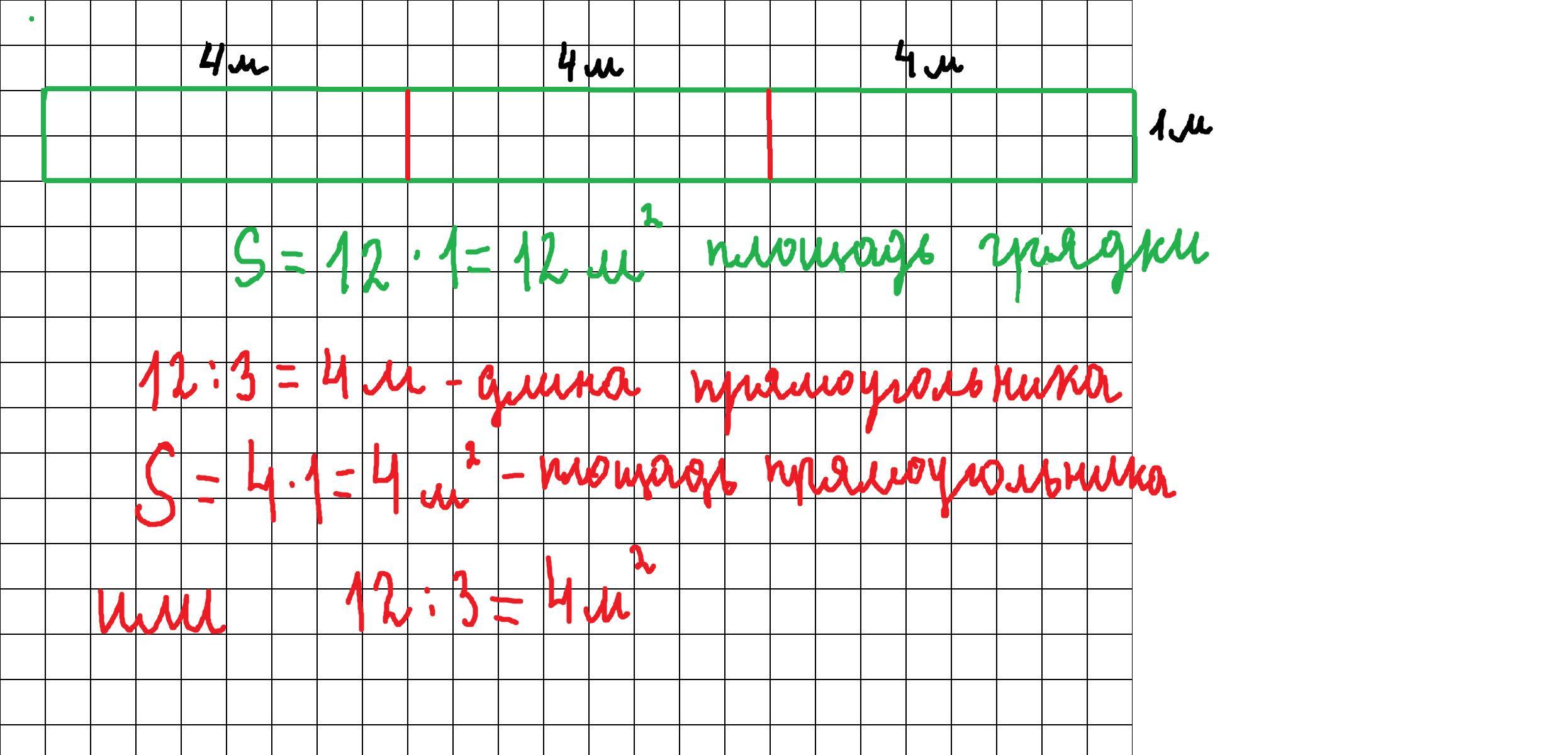 2) 12 ÷ 3 = 4 (метров²) - площадь одной грядки из трёх