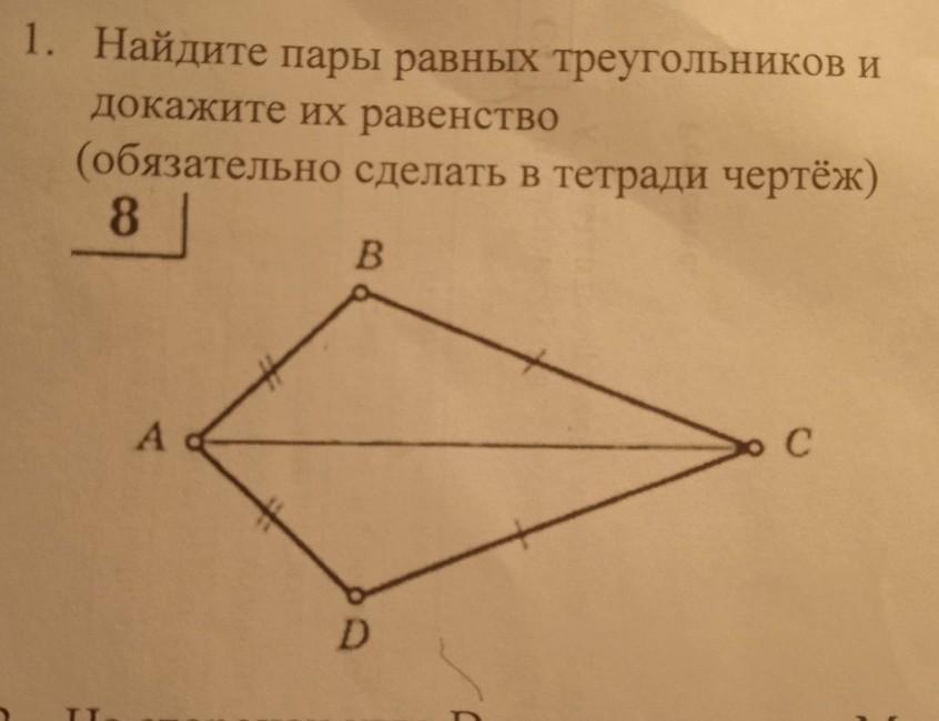 3) сторона АС треугольника АВС = стороне АС треугольника АDС (эта сторона является общей, поэтому её как равную самой себе отмечать не надо).