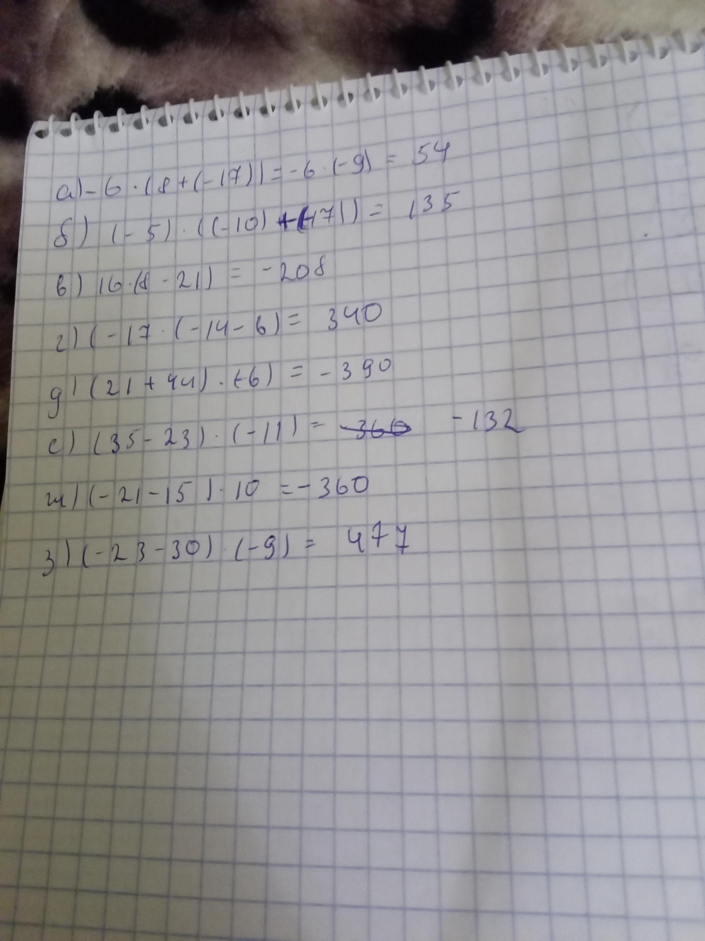 №1. Вычислите: а) - 6 ∙ (8+(-17)); б) (-5) ∙ ((-10) + (-17)); в) 16 ∙ (8 - 21); г) (- 17) ∙ (- 14 – 6); д) (21 + 44) ∙ (-6); е) (35 – 23) ∙ (-11); ж) (-21 – 15) ∙ 10; з) (-23 – 30) ∙ (-9)