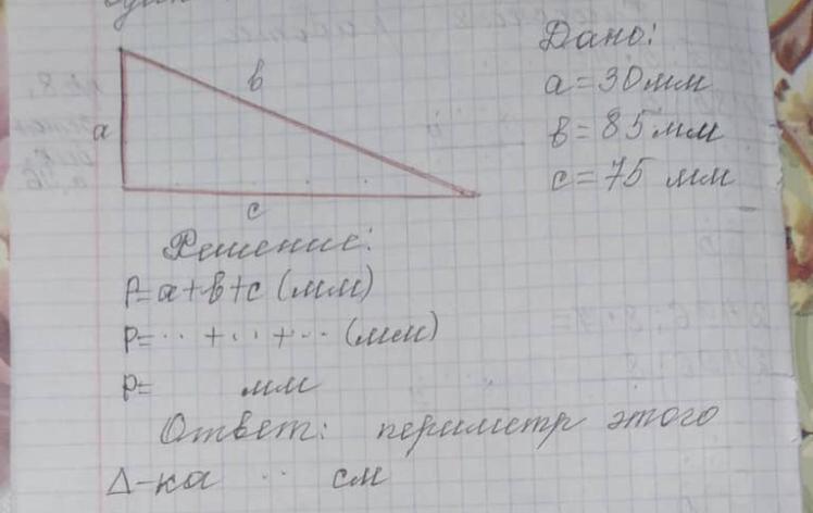 P = a + b + c = 30+85+75 = 190 мм = 1.9 см