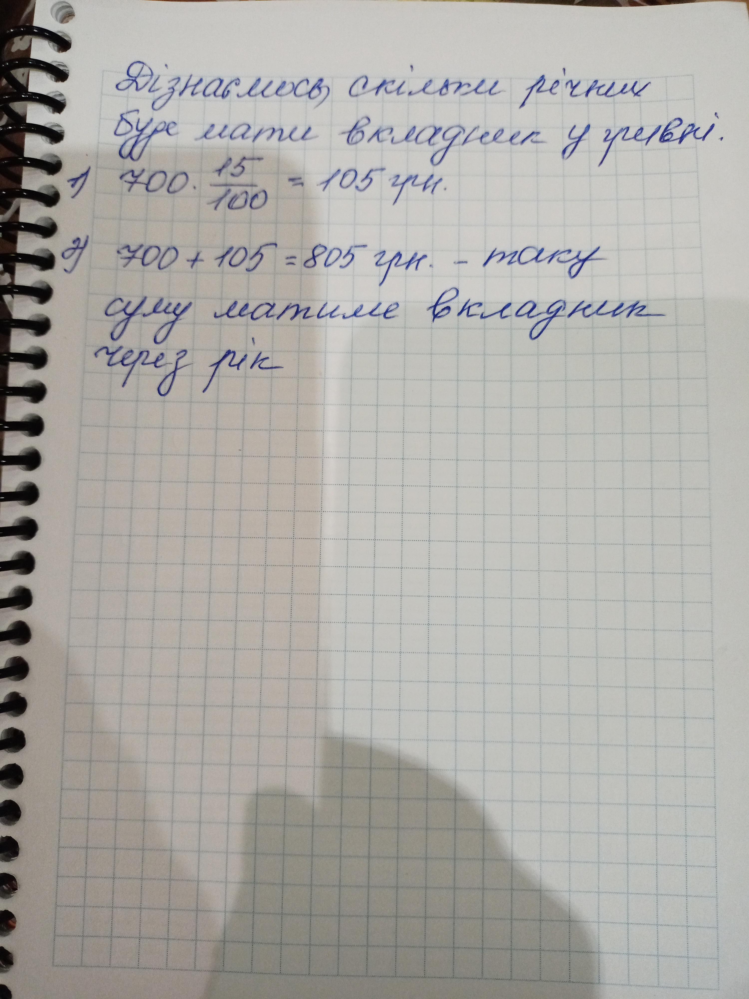 банк відкриває від 15% річних. Яку суму матеме вкладник на рахунку через рік, якщо поклав до банку 700 грн