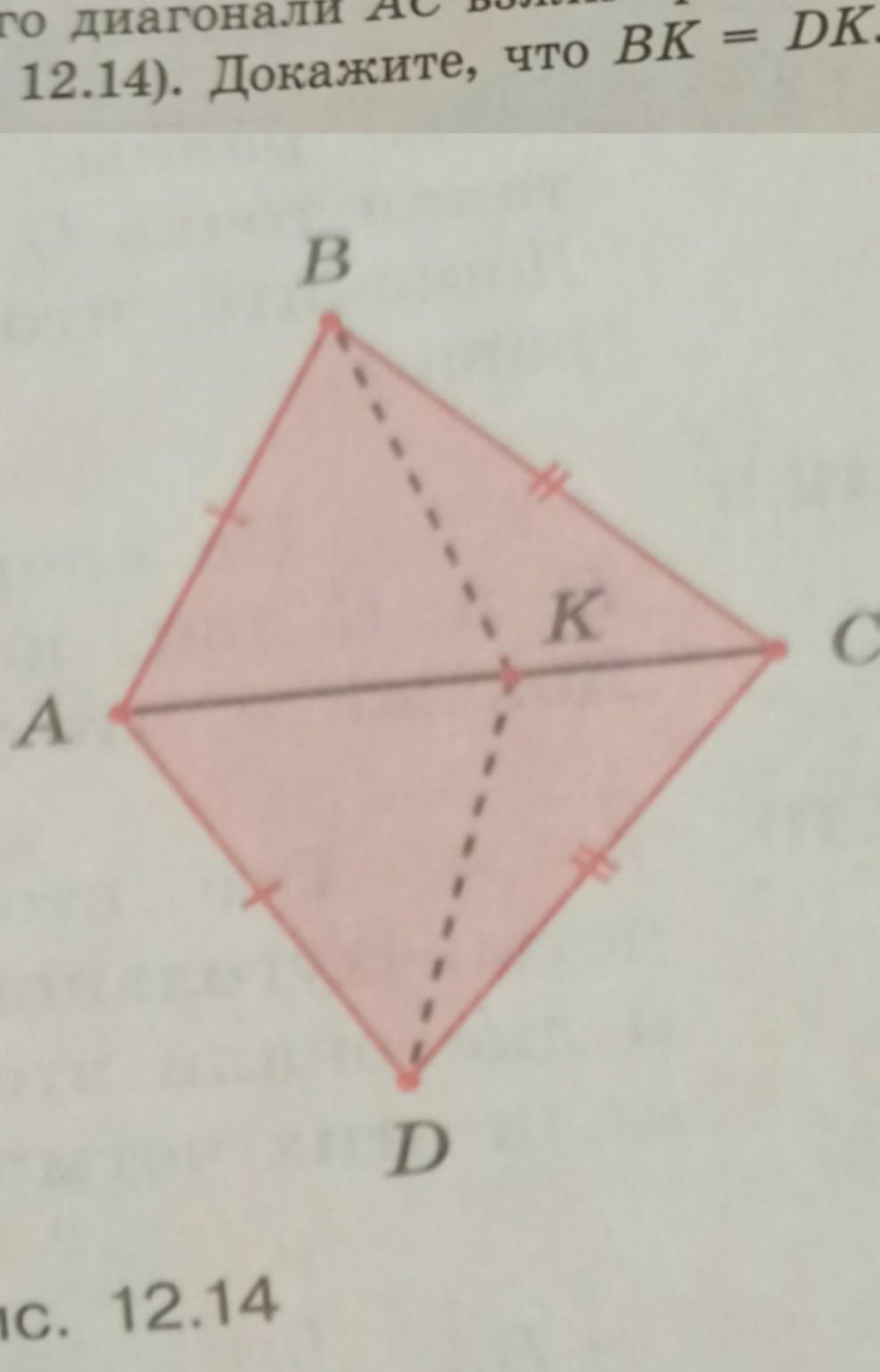 В четырехугольнике ABCD сторона AB равна стороне AD, а сторона ВС равна стороне CD. На его диагонали АС взяли произвольную точку К (рис. 12.14). Докажите, что ВК = DK.