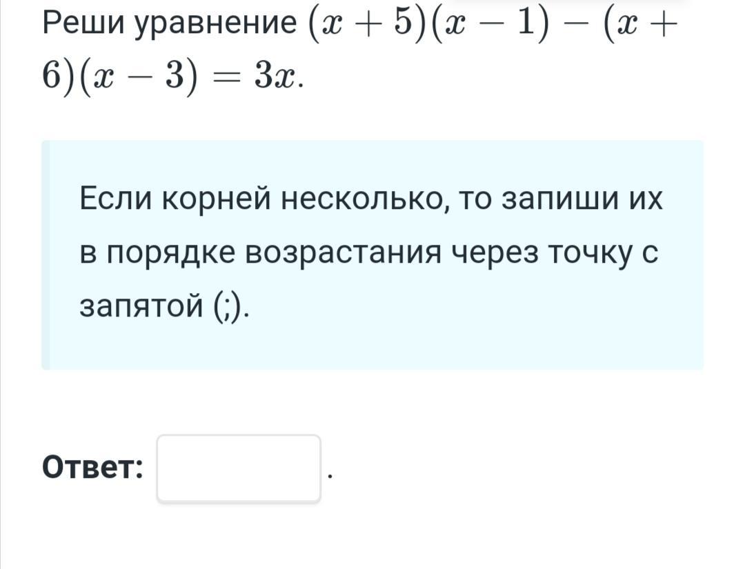 Реши уровней (x+5)(x-1)-(x+6)(x-3)=3x если корней несколько запиши их в порядке возрастания через точку с запятой