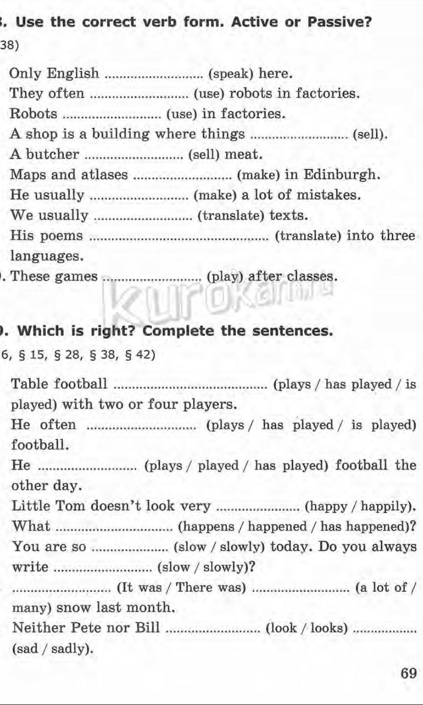 1. Is spoken,2 use,3 are used,4 are sold,5 sells, 6 are made, 7 makes, 8 translate, 9 is translated,10 play. 1 is played ,2 plays,3 has played , 4 happy,5 happened,6 you are so slow. Do you always write slowly 7 it was, a lot of, 8 look,sad