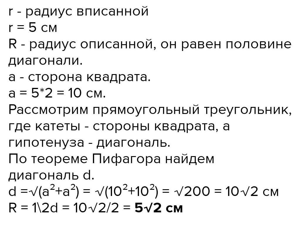 радиус окружности вписанный в квадрат равен 5 . найдите радиус окружности описанной около этого квадрата
