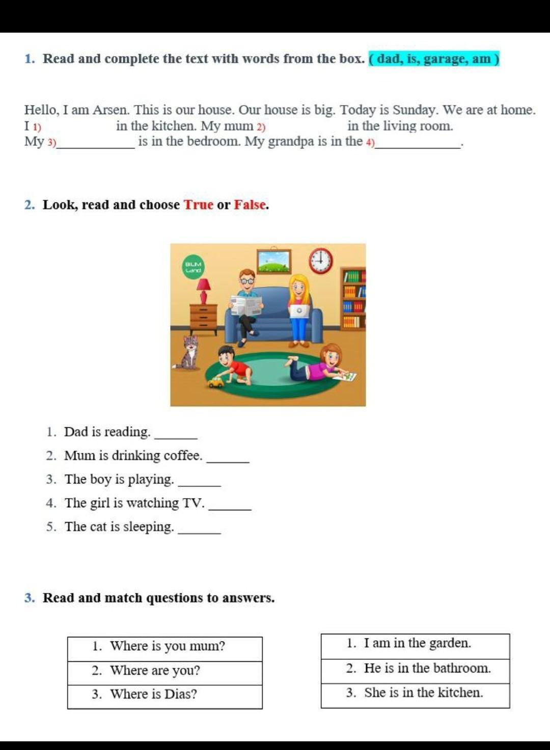 №1 первые два по глаголу to be (am, is, are), а остальные по логике, к примеру, гараж не может быть в спальне.