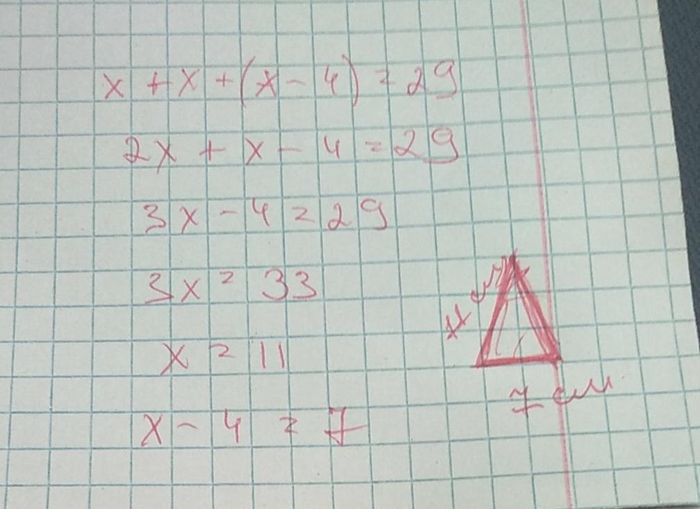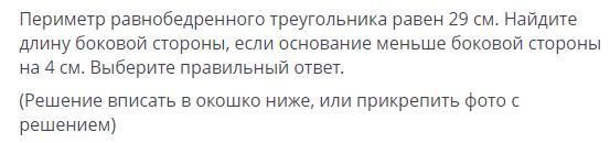 >Периметр равнобедренного треугольника равен 29 см. Найдите длину боковой стороны, если основание меньше боковой стороны на 4 см. Выберите правильный ответ