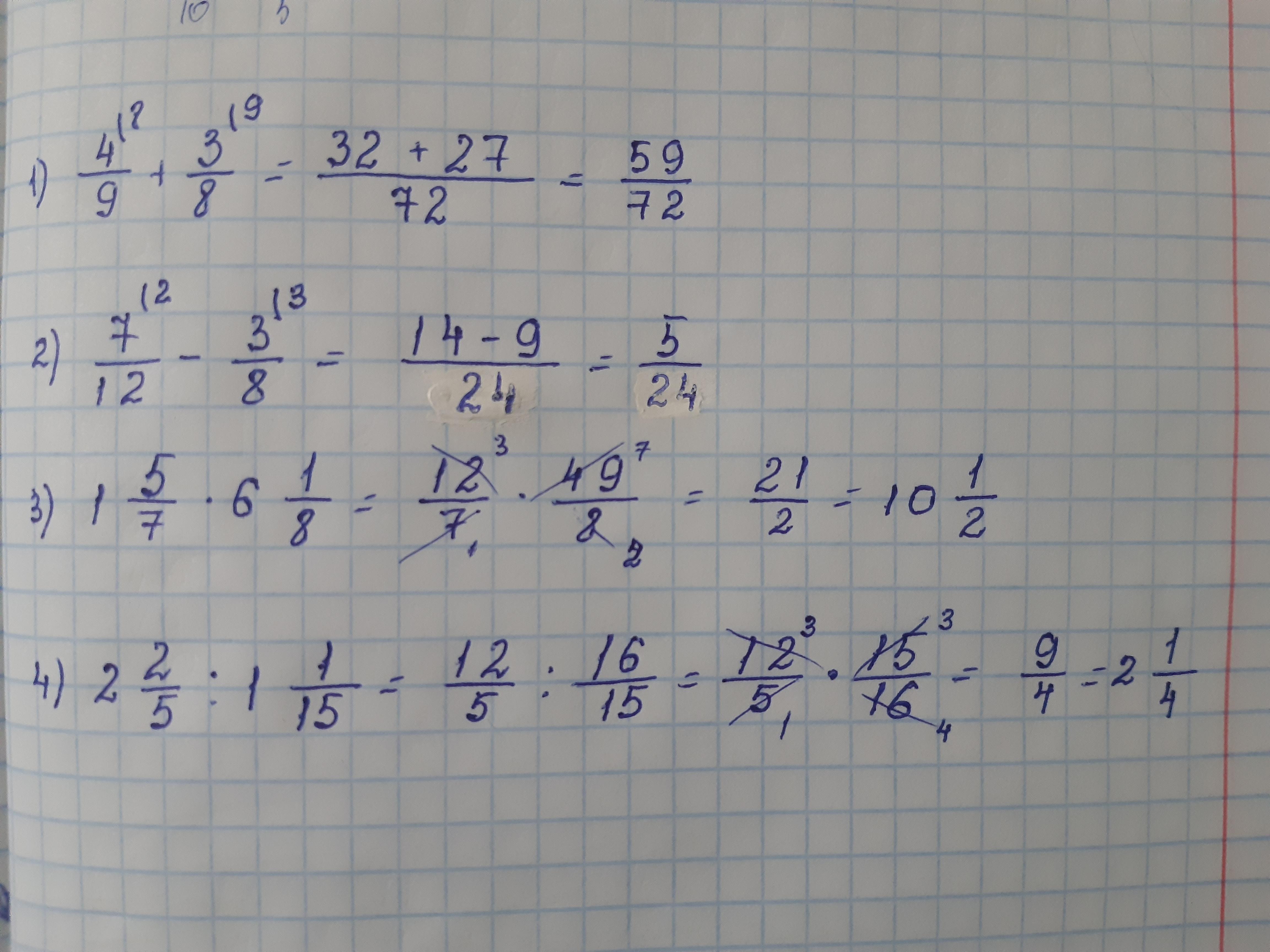 Вычеслите 1) 4/9 + 3/8; 2) 7/12 - 3/8; 3)1 целая 5/7 * 6 целых 1/8; 4) 2 целых 2/5 : 1 целую 1/15