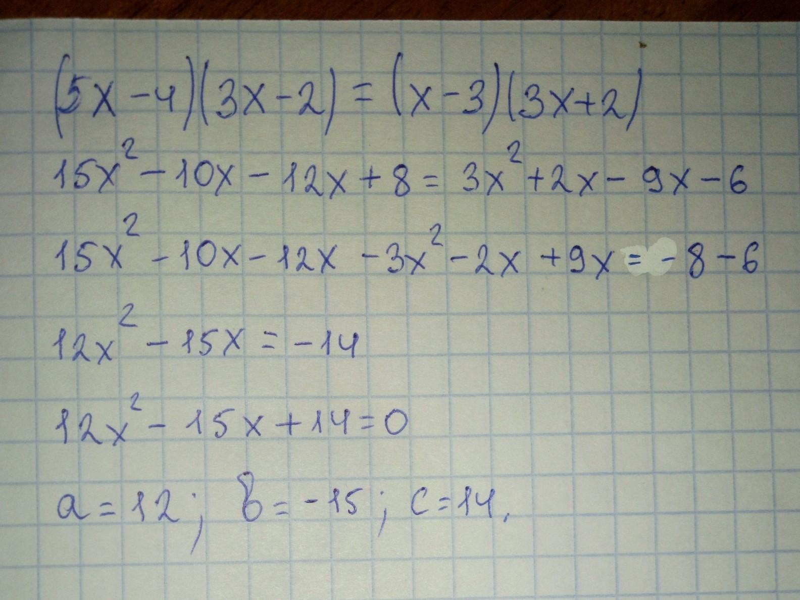 1. Определите коэффициенты a, b, c, приведя уравнение (5x - 4) (3x - 2) = (x - 3) (3x + 2) к виду ax2 + bx + c = 0