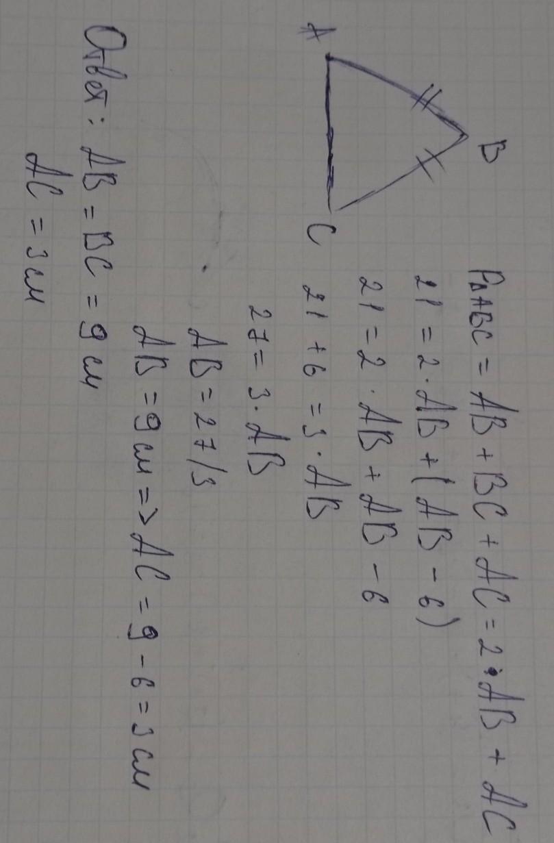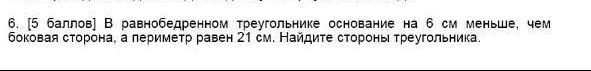 в равнобедренном треугольнике основание на 6 см меньше, чем боковая сторона, а периметр равен 21 см. Найдите стороны треугольника.И ещё чертёж пж!!!!!