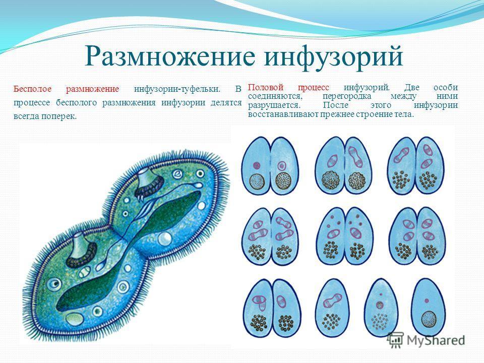 Половой процесс называется конъюгацией. Две инфузории соприкасаются друг с другом, образуя цитоплазматический мостик. Большое ядро разрушается. Маленькое делится несколько раз. " ядра остаются, остальные отмирают. 1 Ядро мигрирует в другую инфузорию, где сливается с ее ядром. Другое остается в свое инфузории и сливается с ядром второй инфузории.