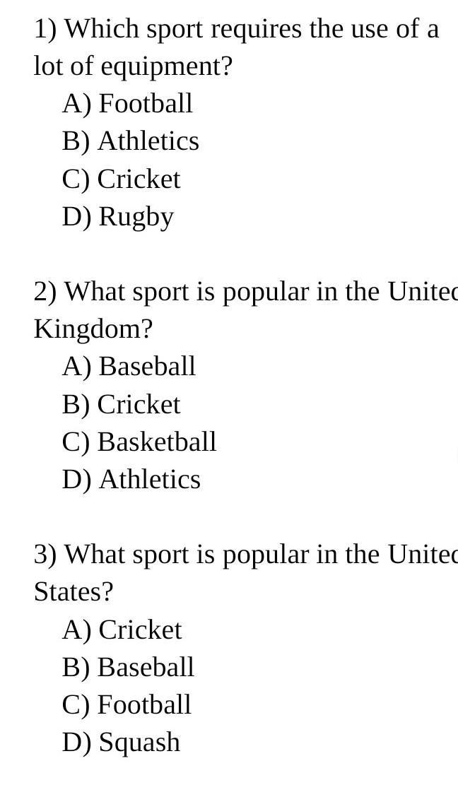 Some people prefer to watch sport. This can either be done by going to a stadium, a local leisure centre, park or on the television. It is often cheaper to watch sport from the comfort of a person’s home than to visit the stadium or a special event. Some sports, such as football and cricket, are really popular in the United Kingdom but not in the USA. In the USA people often play basketball and baseball. However, most countries put aside time to compete in world sporting events such as the football world cup or the Olympics, which occur every four years.