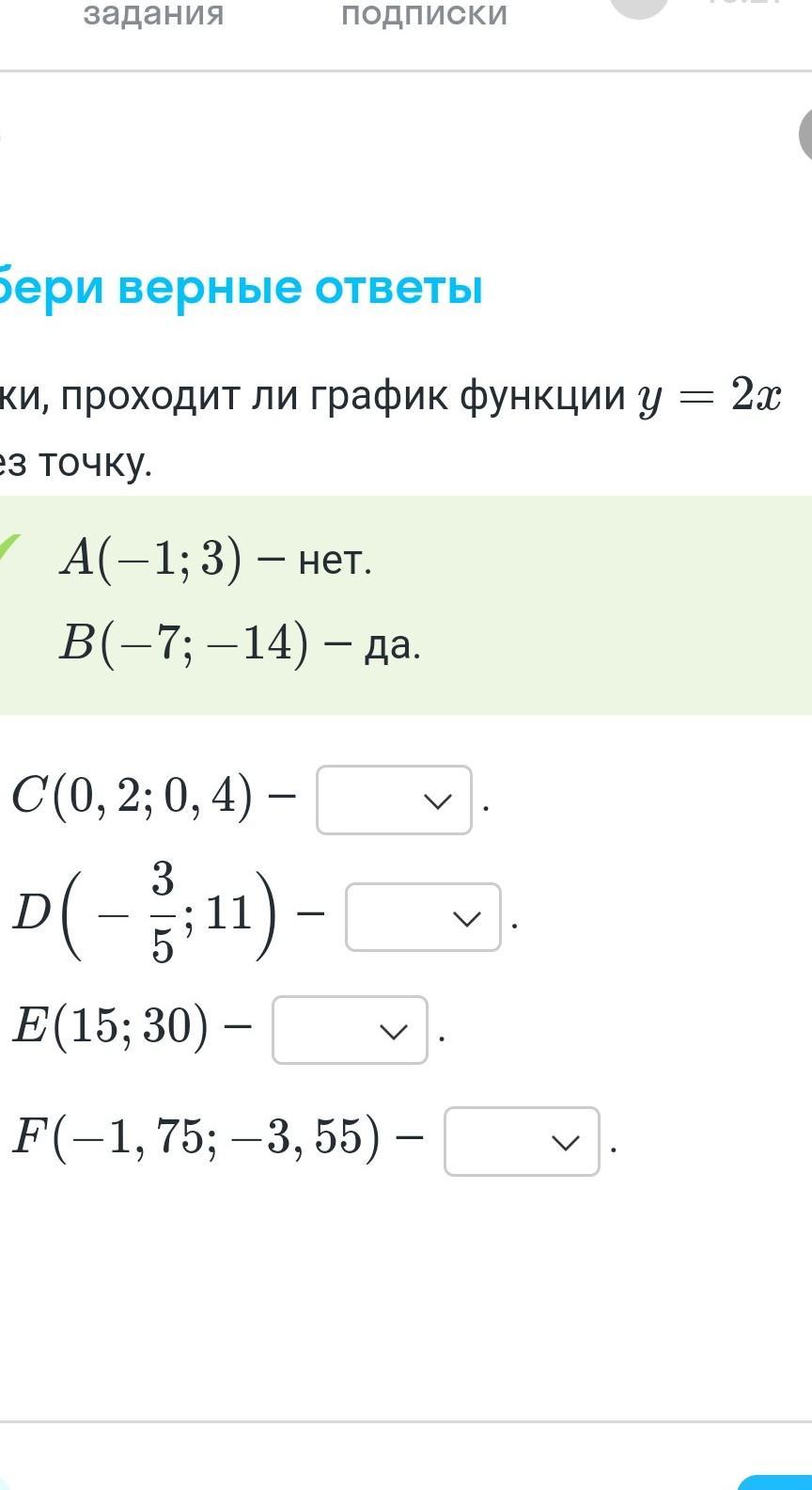 y(x1)=y(-1,75)=-1,75*2=-3,5≠y1 — нет (точка НЕ принадлежит данному графику, то есть график НЕ проходит через данную точку)