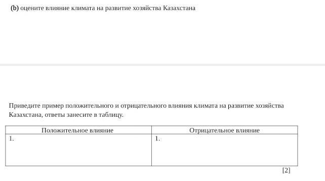 Приведите пример положительного и отрицательного влияния климата на развитие хозяйства Казахстана, ответы занесите в таблицу.