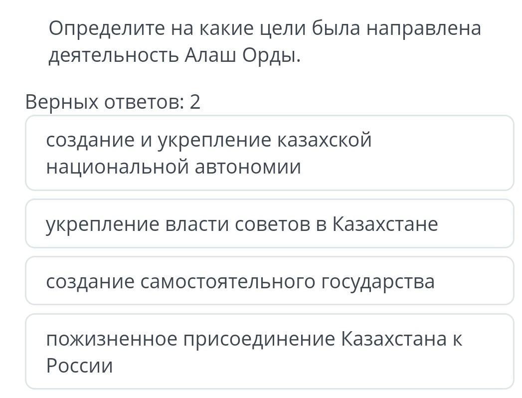 Определите на какие цели была направлена деятельность Алаш Орды. Верных ответов: 2 создание и укрепление казахской национальной автономии укрепление власти советов в Казахстане создание самостоятельного государства пожизненное присоединение Казахстана к России